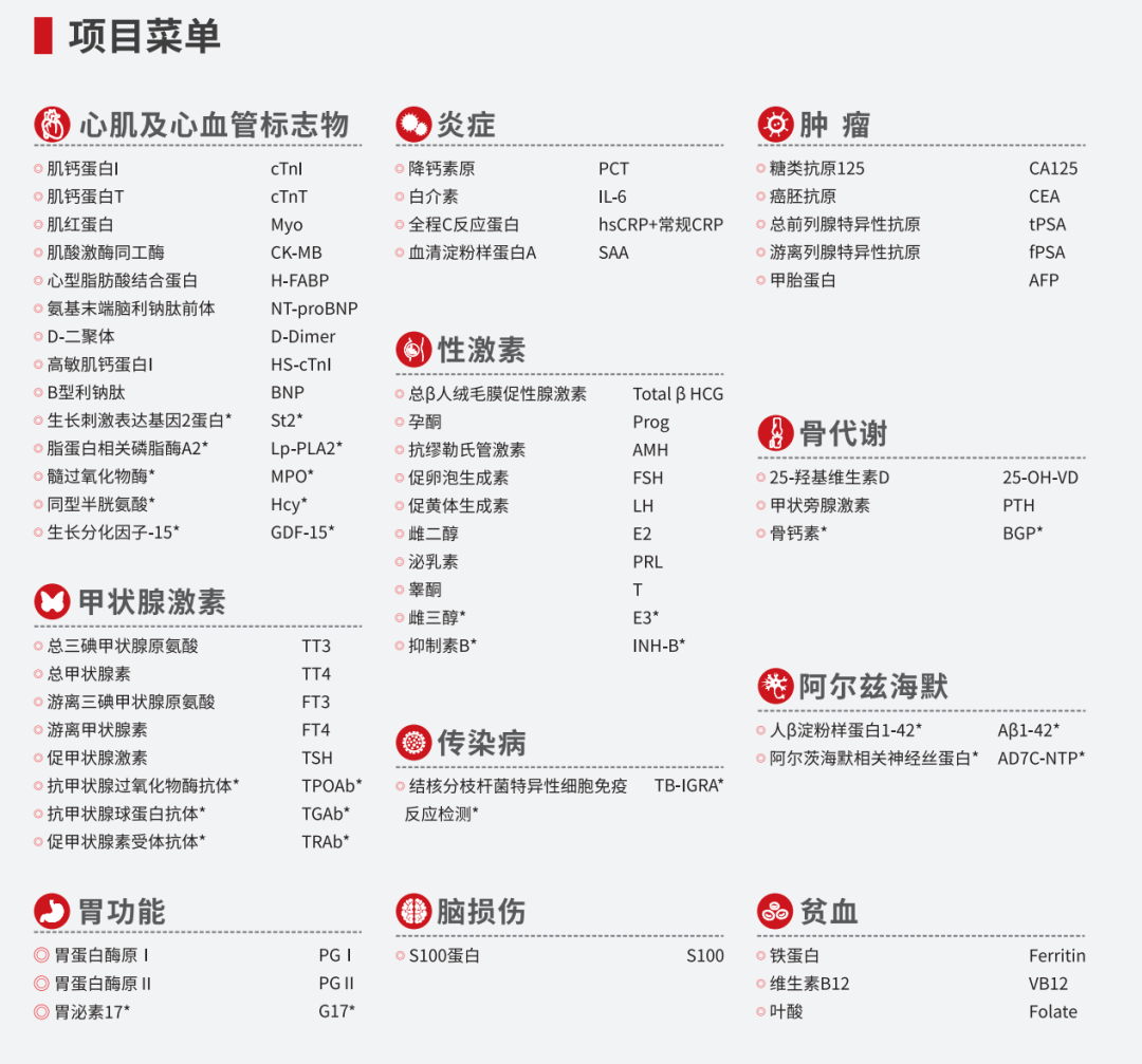 除此之外,患有心腦血管疾病、慢阻肺、糖尿病、慢性腎病、腫瘤、免疫功能缺陷等疾病的老年人,在監(jiān)測(cè)心臟功能、心肌損傷/心梗、血管栓塞、炎癥等指標(biāo)同時(shí),可能還需要進(jìn)行腫瘤、甲功、貧血、骨代謝等其他疾病的診斷。針對(duì)不同的應(yīng)用場(chǎng)景,深圳愛康可以提供全面的檢測(cè)菜單,滿足不同的需要。